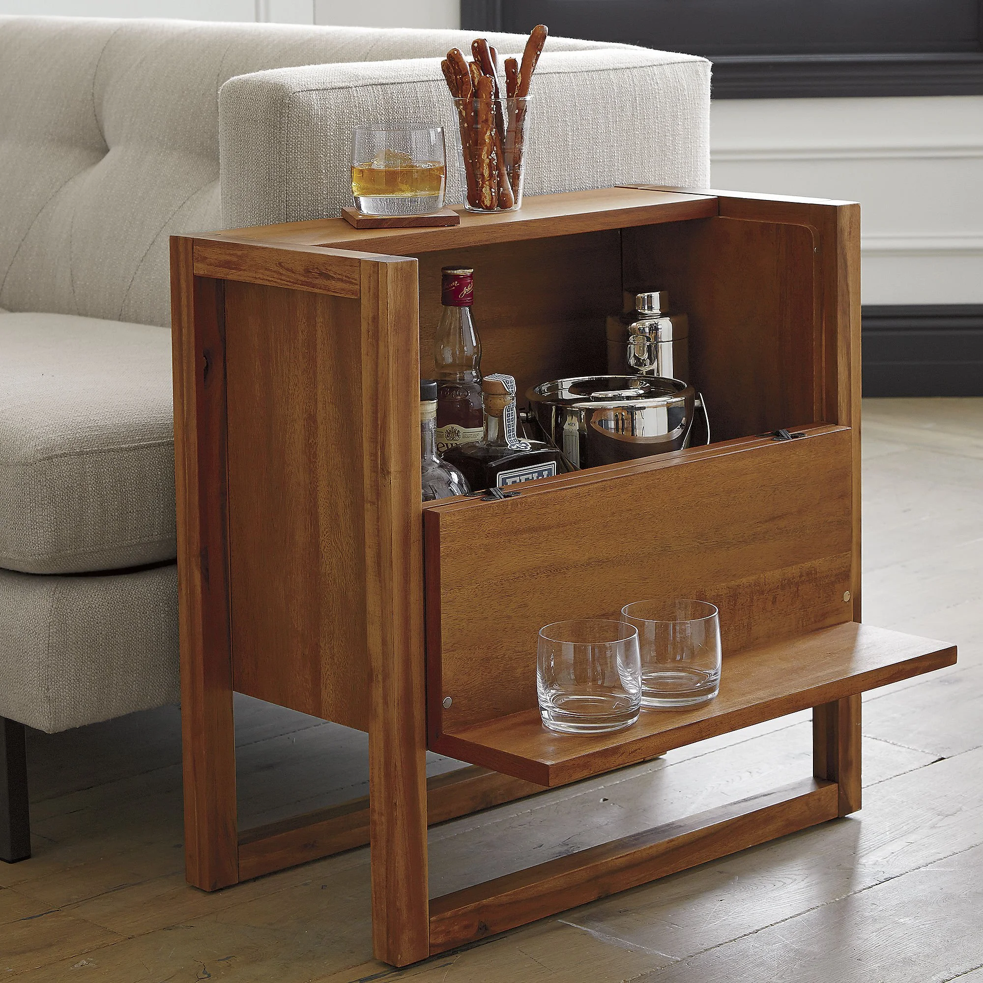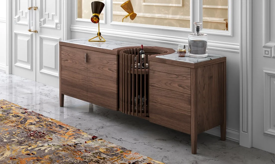 A stand out piece the carousel sideboard is crafted from solid wood (oak or walnut) with complimentary marble tops and features the namesake rotating bar.