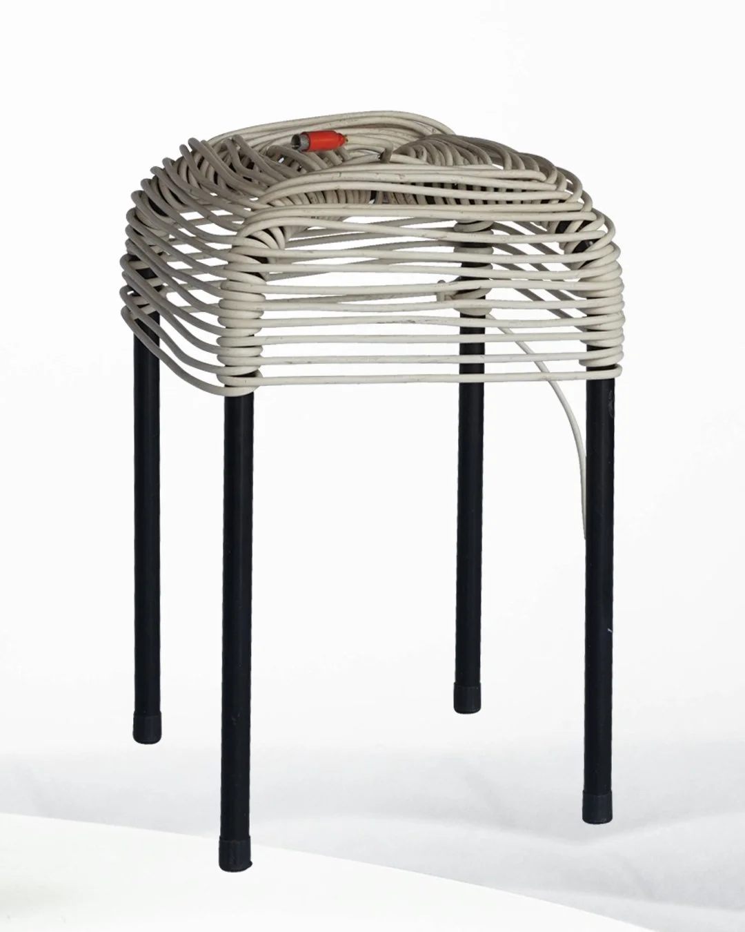 Electric Stool 03 - reclaimed white electrical cords wrapped onto discarded black metal stool frame